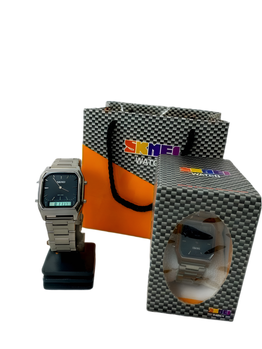 A vintage-inspired square watch combining analog and digital display with Japanese movement and practical features. Water resistant and delivered with full original packaging including gift box, branded bag, and one-year warranty.